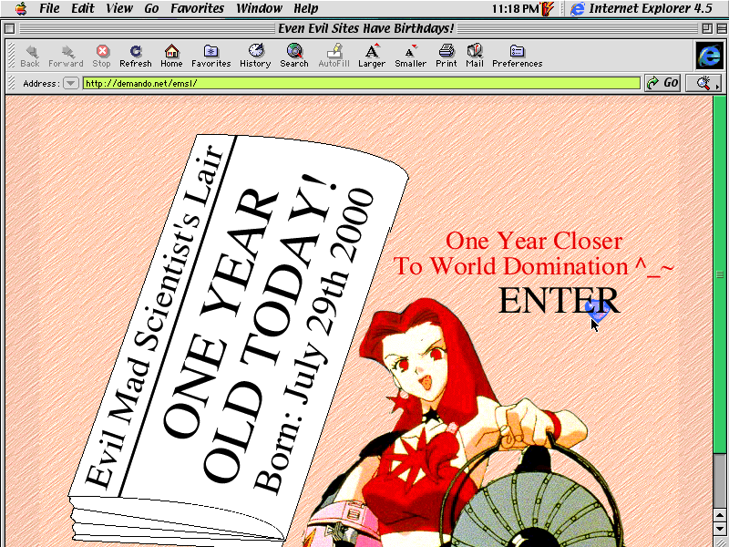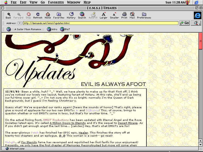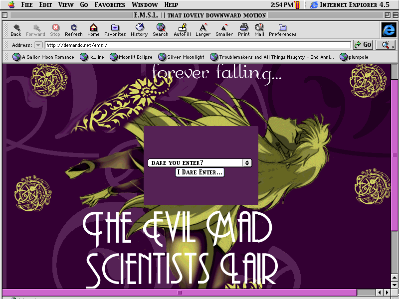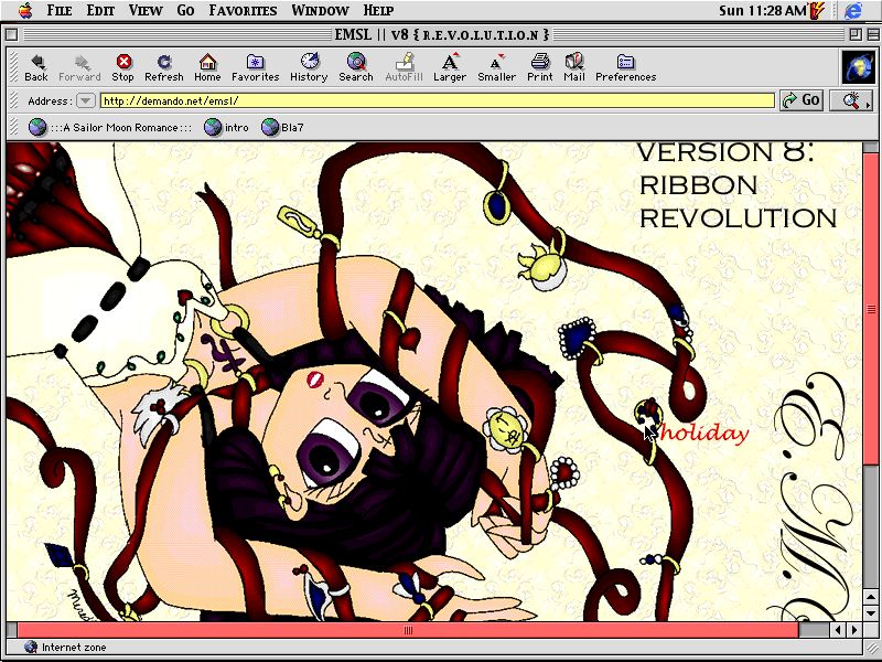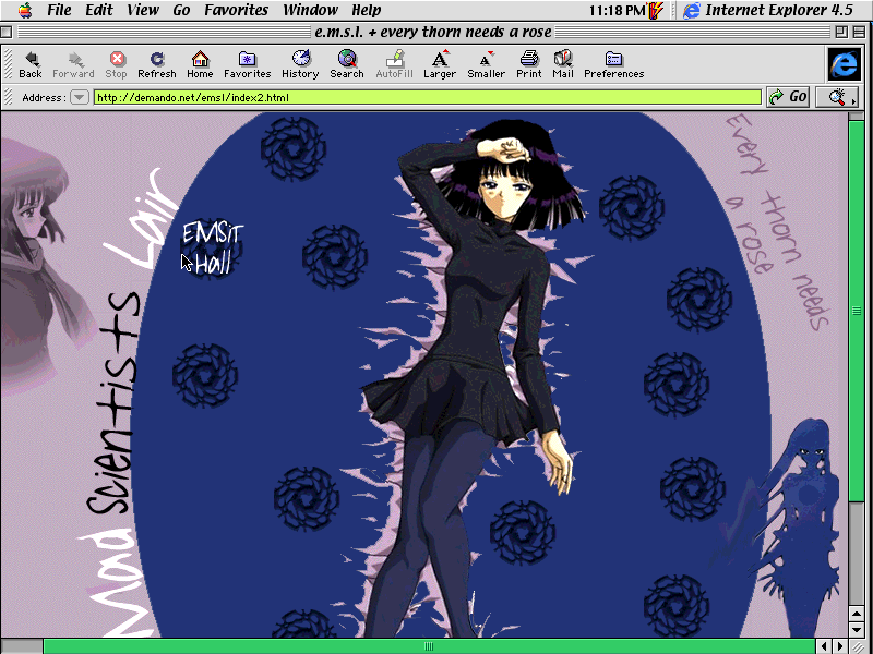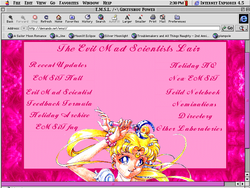 Hardly the EMSL's first layout (it's been up since the summer of '00), but its first on Demando.Net. It was hastily made, hence the reason I forgot to leave room for the guestbook... ^^; Anyway, the image is by fanartist Brian Bork. Cute, ne? A little TOO pink, though.