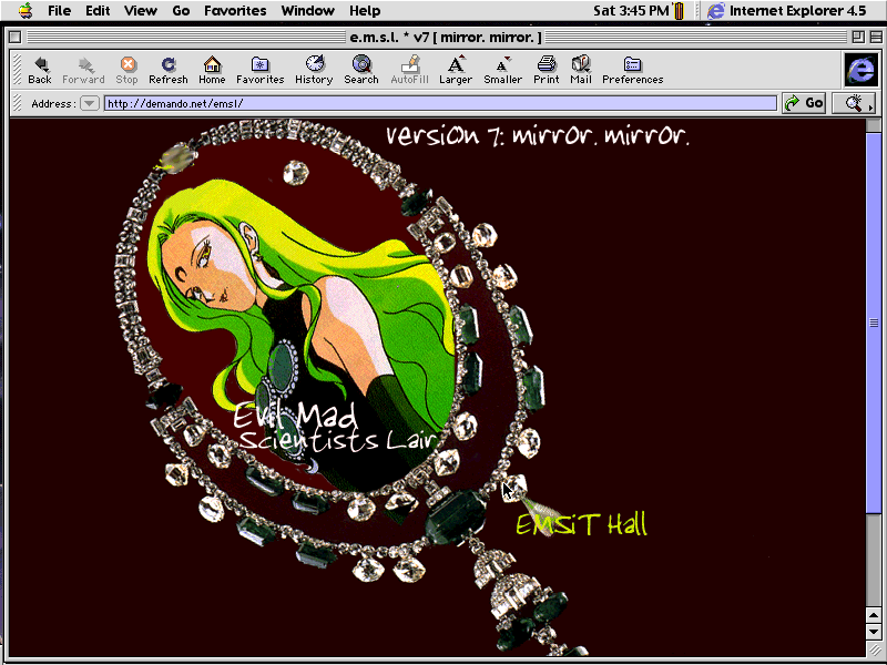 I really liked this layout when I put it up, but now it seems ugly to me. Strange... Anyway, the mirror you see Esmerude in isn't actually a mirror. It's an emerald necklace, part of the Smithsonian collection. When I visited D.C. a couple of years ago, I went to the Smithsonian; the jewelry there is TO DIE FOR. ^_^; Anyway, I took tons of pictures, which I knew wouldn't turn out. Then I bought postcards featuring the National Collection, which I scan in sometimes to use for layouts. Even if the layout is ugly now, I still like the picture of Esmerude. It's one of the better ones of her.