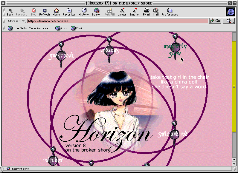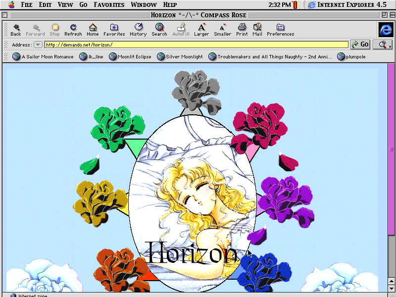 A fairly nice layout, I suppose, but the rose motif is getting a little old. No more roses- bad Meredith. Naughty. ^_~ Anyway, I liked the Compass Rose pun. In case you can't tell, the image of Usagi is taken from the artbook scan in which she, Mamoru and Chibi-Usa are in bed. It's cute, if you can ignore the spore. ^_^;
