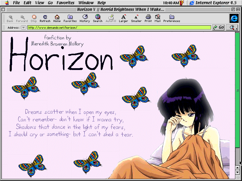 Yes, there are colored butterflies, but at least they aren't roses. The poem in the center is mine, and of course it isn't any good. ^_^ Oh well. I rather like this one, despite it's simplicity. ^_^ There are so many neeat images of Hotaru floating around...
