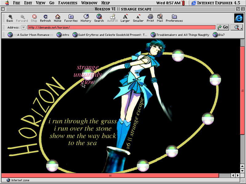 It's definitely different, but I like it. I think that the animation in the opening to Stars is some of the prettiest in Sailor Moon, so I couldn't resist using something from it. Mercury really does look like she's flying. The bottle was from a wallpaper that came with my iMac, and the lyrics in the circle are from Stevie Nicks' "Trouble in Shangri La".