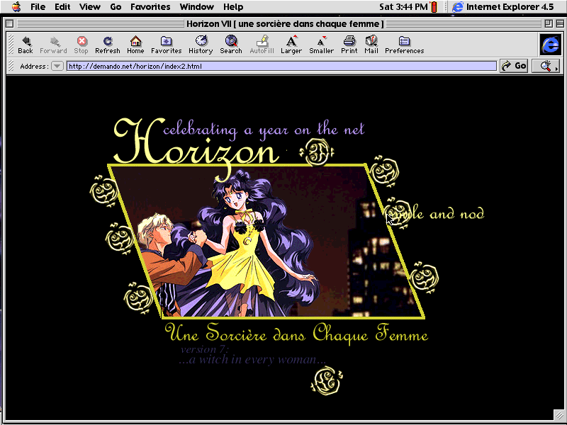Yes! Horizon lasted a whole year on the net! I am so proud... I've definitely come a long way in designing since the days of freeware grapics and endless inner pages. I chose Human Luna because I think she's incredibly pretty-- the image was too nice to pass up. I actually cut out the background, which was very ugly, and added in New York City. The title of this layout is "une sorci?re dans chaque femme" which is French for 'a which in every woman'. I think that's definitely true!