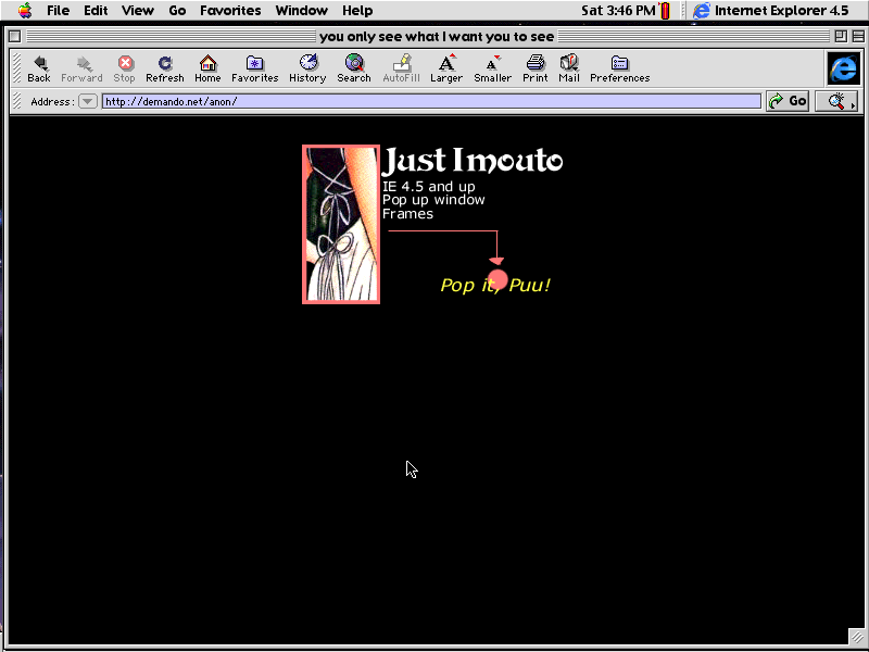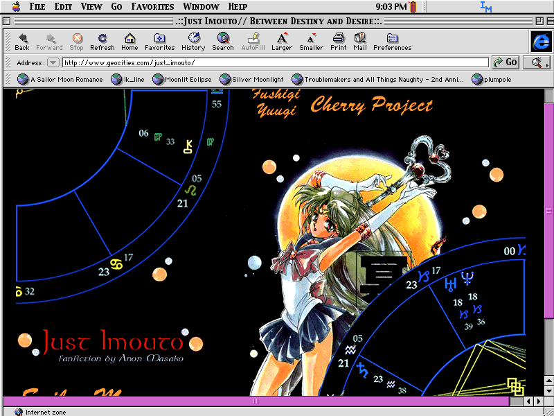 This Just Imouto's first layout, and BOY was it up for a while. @_@ Anyway, I read astrological birth charts, and as I was making the layout, it occured to me to use the wheel of the Twelve Houses in the design. I love the 'long suffering' look in Setsuna's eyes. Isn't the doujinshi image pretty, too? The only complaint I have about this one is that there were WAY too many pop ups. I learn a new code and I go wild with it...
