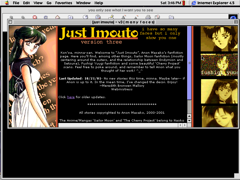 Don't ask me where this came from-- I have no idea. ^^; However, it looks moderately nice; especially the manga image of Setsuna on the side. As for the navigation images of her, I was trying to make them looks like T.V. screens on the fritz. Not sure if I succeeded. The words behind Setsuna are from Stevie Nicks' "Spinning Wheels". Hmm.. I'm sensing a pattern here.