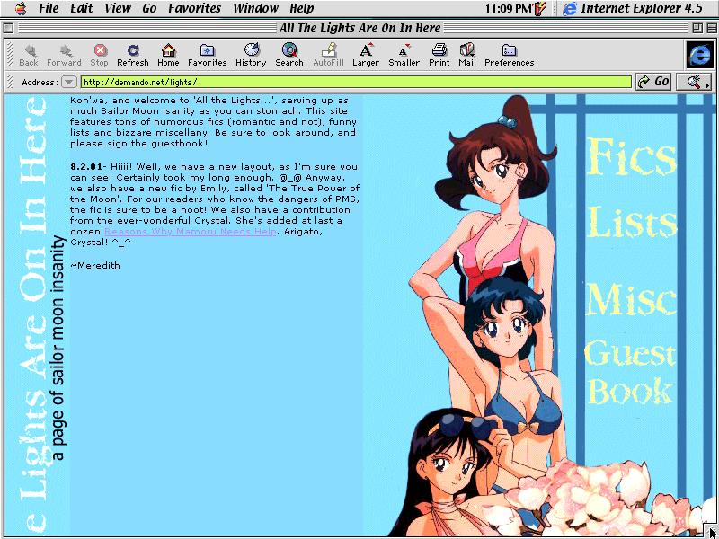 So, it's not the most original layout in the world, but it's new and it isn't pink! ^_^ I did really want to use that image of the senshi at the beach, but I cut out Minako and Usagi. Not that I don't like them, mind you, but they seemed to interupt the blue theme I was going for. Anyway, I did borrow the tropical flowers from Usagi's hair. Also, if you've seen any of my other layouts, you know those cherry blossoms pop up all the time. This is in frames, too. WAI!