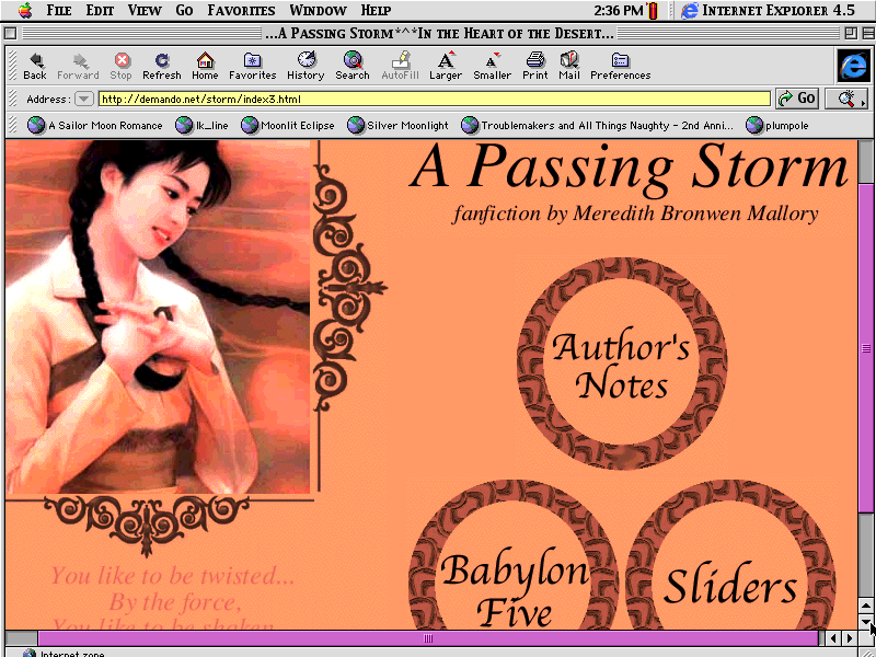 This was actually my first Java Script layout, and it took me literally weeks to figure out the code. It turned out I'd had the Windows version when I needed the Mac.. Really, we can't ALL have superior taste in computers- it's not my fault I love my Mac. MOVING on... the beautiful image is from a Tiawan romance novel, by husband/wife mangaka team of Ping and Fen. All their work seems so real!