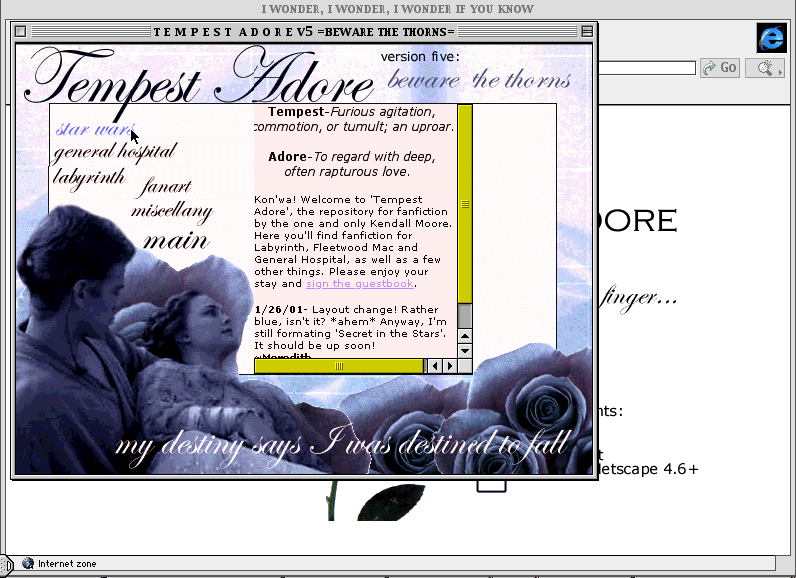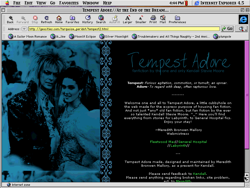 This layout was far too dark, and I do believe I mutilated the image of Sarah and Jareth (from the 'Labyrinth', for your information). I *really* hate this layout. Mind you, this actually wasn't the first- the one prior was merely a black/red moon motif. What is it with moon and I?