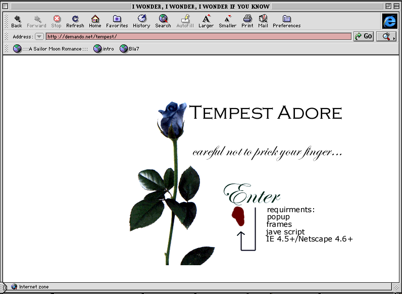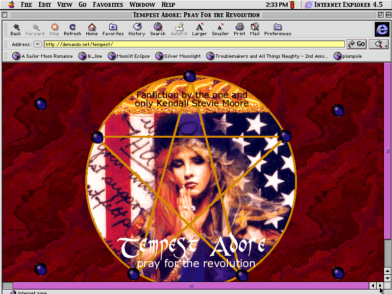 I *do* like this layout. The image inside the pentacle is from Stevie Nicks' single release of 'Desert Angel'. I borrowed the blue (originally red) roses from the cover of a Sailor Moon LP. Have I mentioned I love Java Scrip? ^_~