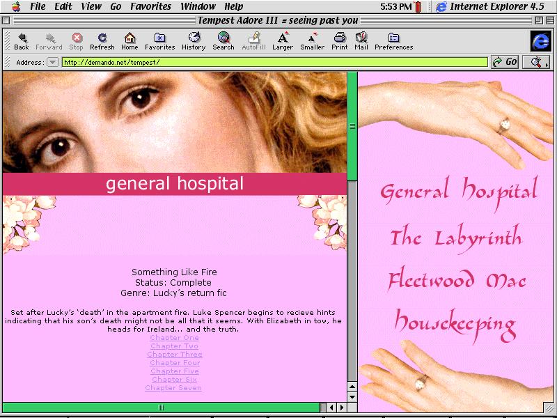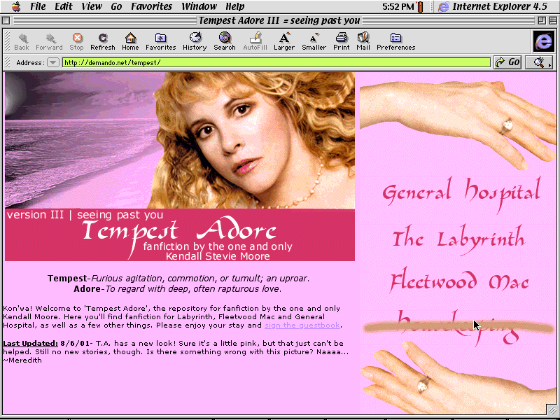 It's pink. Just really, very, incredibly pink. Once you get past that, however, it's a very decent layout. Kendall and I went to see Stevie Nicks at Riverbend in July, and the show was incredibly moving. The way Stevie sang 'Trouble in Shangrila', along with the background she had onstage, sort of inspired this layout. I used a real photo of a beach to put behind Stevie. Oh! And the image of her is from an issue of People Magazine. Also, the hands on the side are hers. ^^;