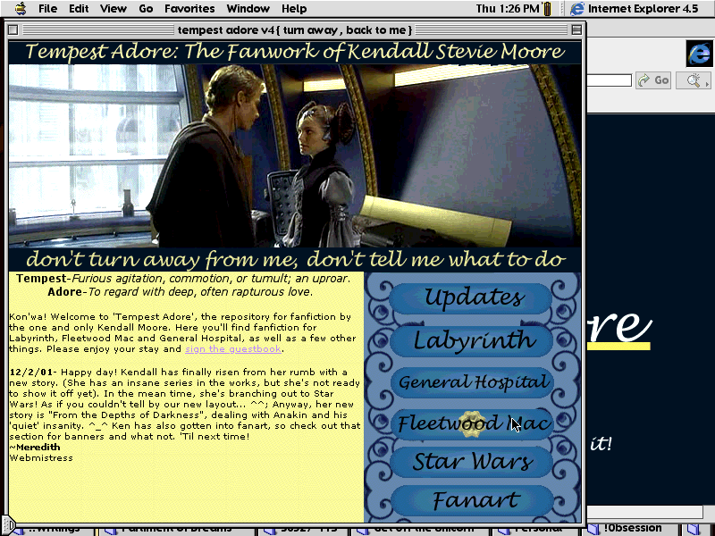 Utena has once more crept into my layout-making. It's not my fault the imagery is gorgeous! ^^; The blue roses were snatched from the 'this is animation' artbook. As for the pic of Padme and Anakin, it's a screen capture from the almost-famous lap scene aired on MTV. One of Kendall's favorites, of course. Unfortunately, it seems that I may have to scrap this one, as it doesn't turn out correctly on Windows computers. Well, it is awfully small...